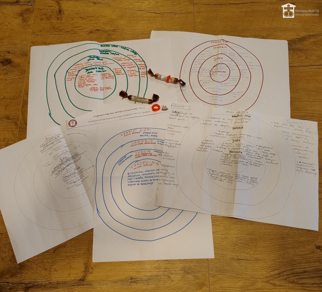 Po przerwie nastał czas na pracę w grupach. Na podstawie fragmentu z Dz 1, 1-11 mieliśmy sobie uświadomić do kogo i gdzie jesteśmy posłani, a także jakich środków należy użyć, by nieść Dobrą Nowinę. Jerozolima – dom, rodzina; Judea – środowisko, w którym żyję; Samaria – miejsca trudne, nieprzyjazne; Krańce ziemi – miejsca odległe. Bez Bożej pomocy w żadnym z tych miejsc nie jestem w stanie działać. Czasem ciężko jest nawet głosić Ewangelię we własnym domu. Od siebie samego muszę zacząć ową misję. Sam dla siebie jestem misją. Chrześcijaństwo to styl życia. Dzieciaczki widzą wszystko. Osoby z bliższego i dalszego środowiska oceniają po zachowaniu. Samaria budzi lęk, tam trzeba wielkiej odwagi i miłości.